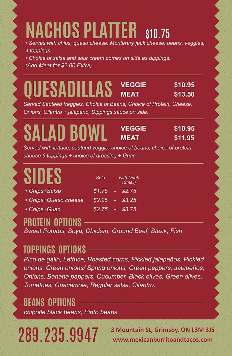 Welcome to Mexican Burrito & Tacos, a culinary gem nestled at 3 A Mountain St Unit 3B in Grimsby, Ontario. This brand is dedicated to bringing the vibrant and authentic flavors of Mexican cuisine to your plate, serving up an impressive array of burritos, tacos, and quesadillas that promise to satisfy even the most discerning palate.